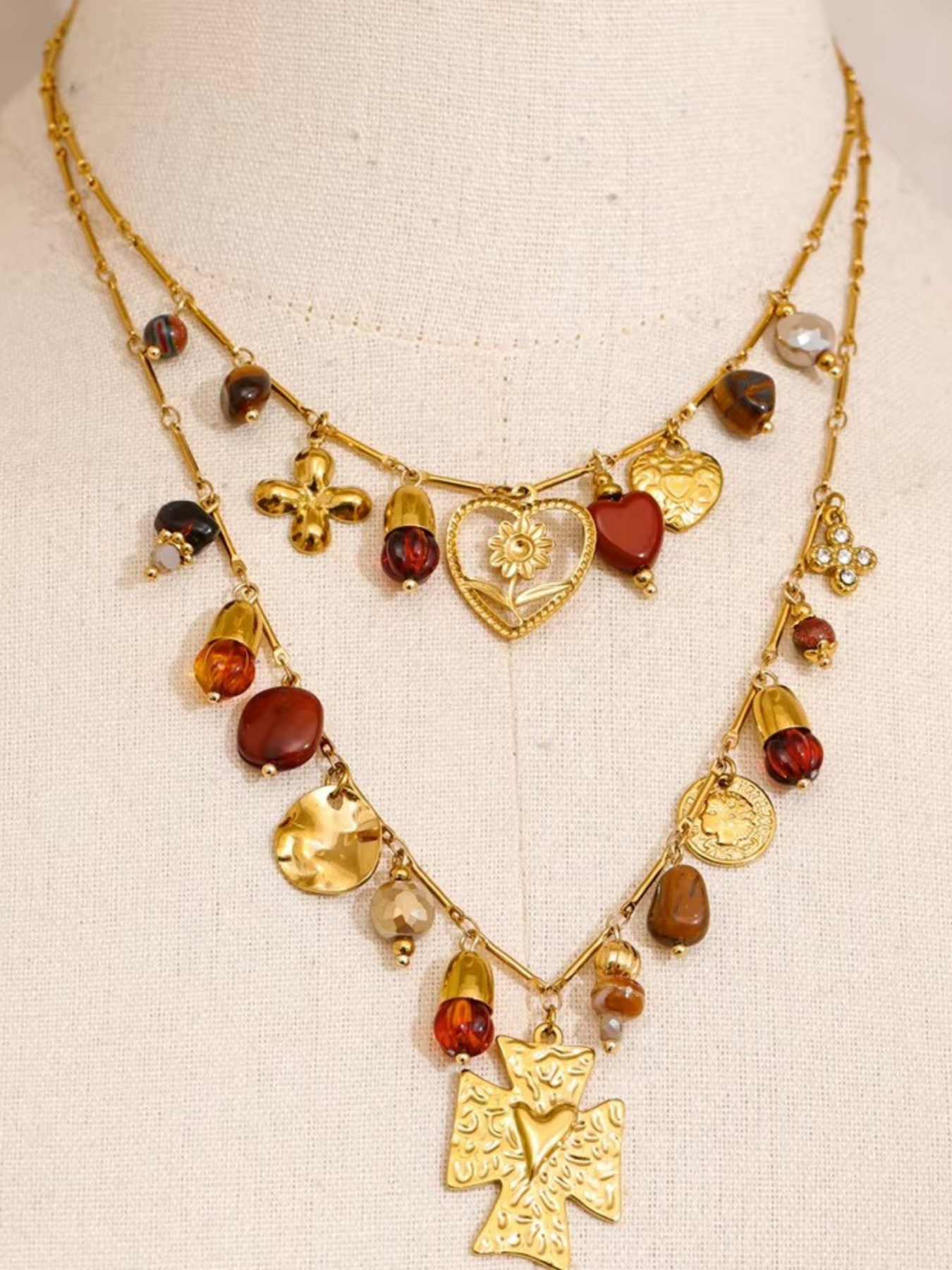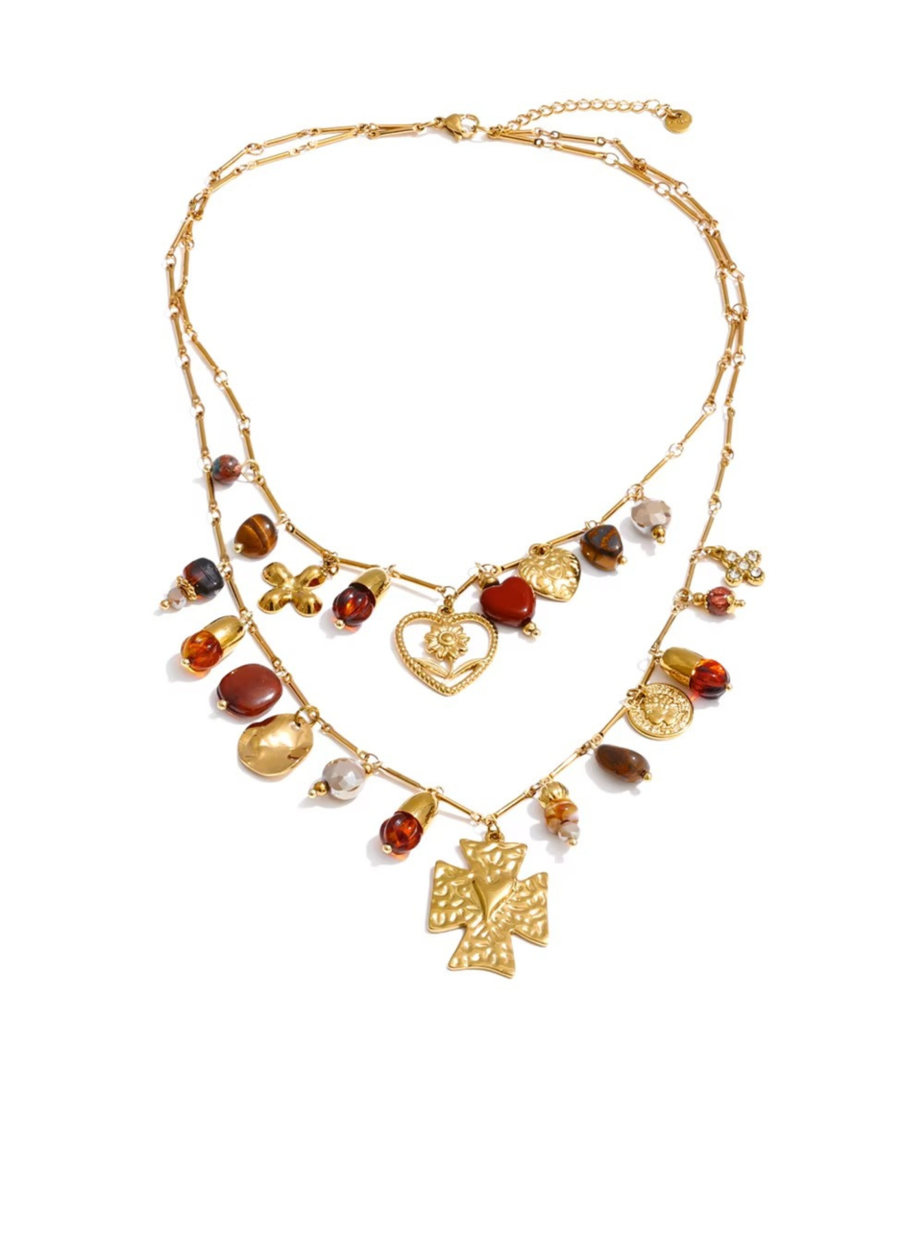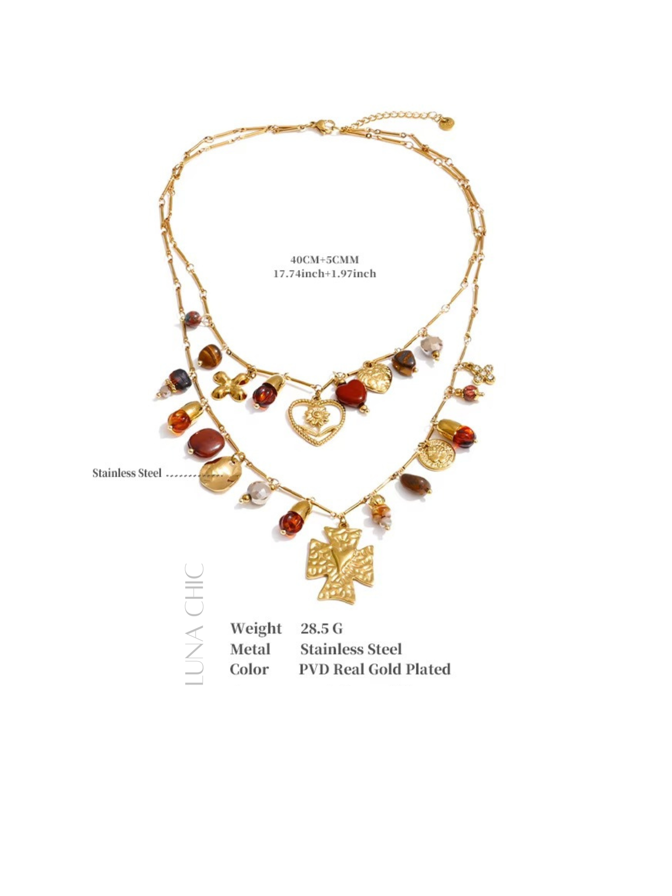 An elevated take on statement styling, this dual-layer necklace features symbolic charms and textured forms that create movement and depth. Crafted in premium non-tarnish metal with rich 18K gold plating, it shines with confidence and durability. Designed to stand out without effort, this piece defines modern luxury.